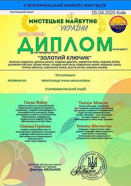 На всеукраїнському конкурсі мистецтв «Мистецьке майбутнє України», який відбувся дистанційно 5 квітня 2025 року в м. Києві за підтримки Центру культурних та освітніх програм, учасники театрального колективу "Золотий ключик " та "Ілюзія" (старша група) нагороджені ll премією у відповідній віковій категорії, а керівник - подякою за підготовку учасників до конкурсу та плідну співпрацю і розвиток культури.