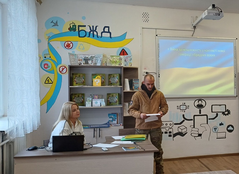 Кульмінацією заходу стало представлення особистих історій військовослужбовців та ветеранів. Особливим гостем ліцею став його колишній учень — Іван КОЛАЧУК, нині учасник бойових дій 32-ї ОМБ, танкового батальйону, ветеран, учасник бойових дій, молодший сержант та кавалер нагрудної відзнаки «Золотий хрест». Він поділився своїм бойовим досвідом, акцентуючи увагу на важливості стійкості, побратимства та усвідомленого захисту Батьківщини. Учні уважно та з глибокою повагою слухали розповідь Захисника і активно виконували завдання, які були подані у презентації, що сприяло кращому засвоєнню складної, але життєво необхідної інформації.