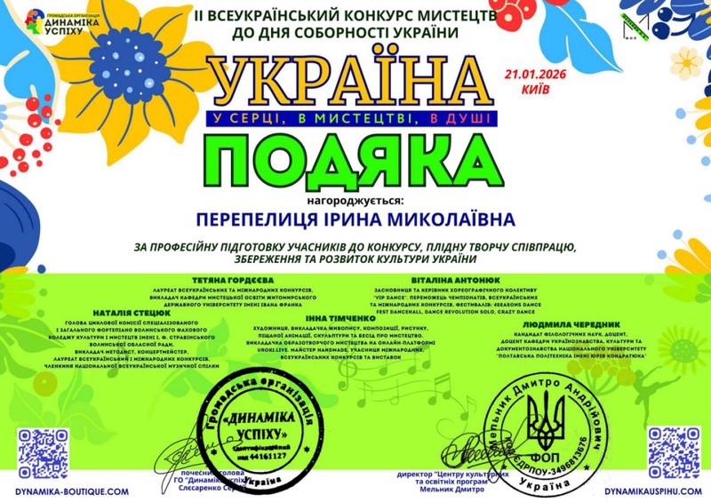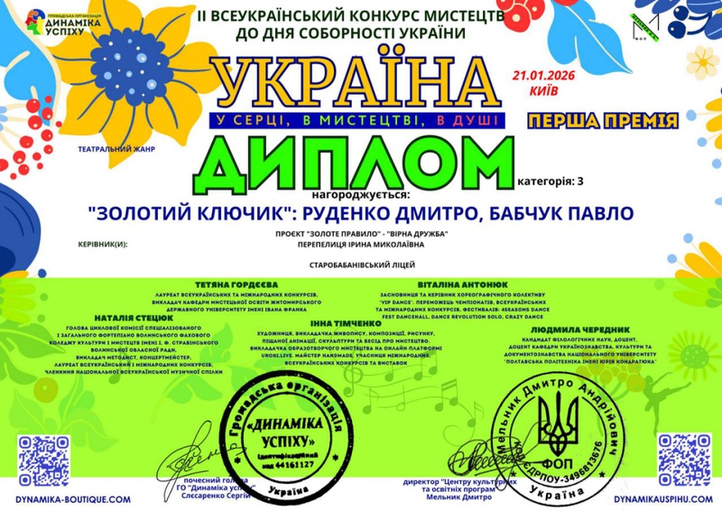 Гуртківці Руденко Дмитро та Бабчук Павло першими приєднались до проєкту і вибороли І місце у конкурсі присвяченому до Дня Соборності України. Учасники нагороджені іменними дипломами, а керівник подякою.
